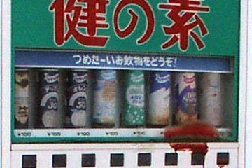 「健の素」の緑色の自販機。サンプルのラインナップはVIVOのオンパレード。