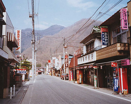 川治温泉中心街を何気なく撮った中に写りこんでいました。大黒屋という土産物店の門前です。