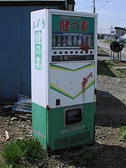 「健の素」の緑色の自販機。サンプルのラインナップはVIVOのオンパレード。